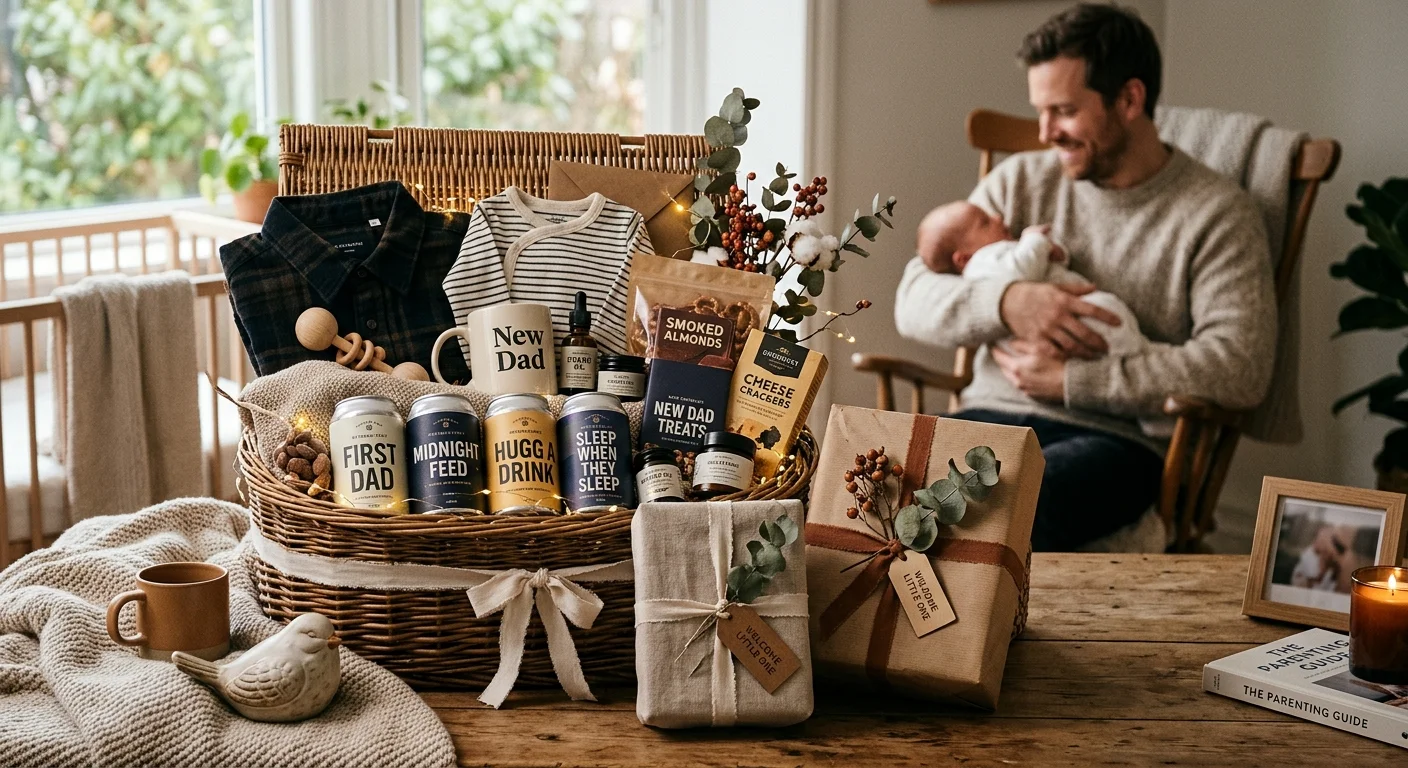 Undgå generiske gave-til-far-sæt uden personlighed. Vælg i stedet noget, der matcher hans smag — eller noget, der direkte adresserer den nye situation: en gavekurv til "overlevelse" de første uger, et whisky-sæt til den eftertragtede fri aften, eller et sjovt krus han kan bruge til de mange natlige kaffekopper.