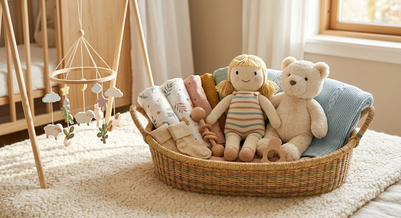 En gennemtænkt barselsgave med udvalgte babyartikler til den nyfødte — pakket med kærlighed.