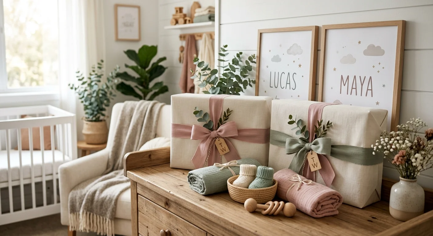 Alternativt kan du give noget personligt der fejrer det unikke ved at være tvilling. Barselsgaver til mor er en anden populær vinkel — tvillingemødre er markant mere udmattede og fortjener ekstra omsorg.