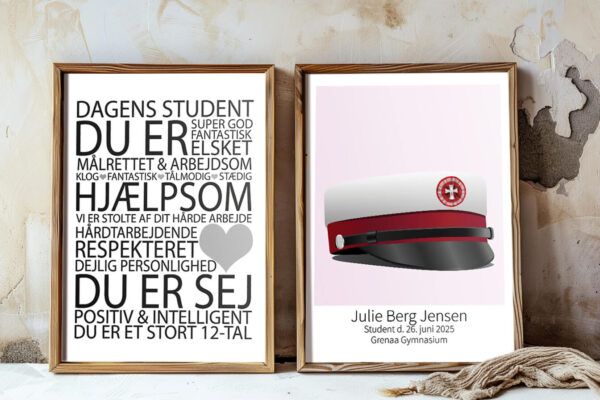 Giv en personlig studenterhue-plakat til dimittenden – vælgal huetype og farve, og tilføj navn, dato og uddannelsessted. Trykt på eksklusivt papir og klar til at pryde væggen i studieboligen. Det er en stilfuld og mindeværdig gave, der fanger glæden ved dimission og bliver et dekorativt minde i mange år frem.